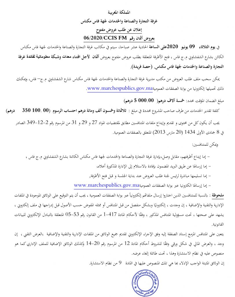 إعلان عن طلب عروض مفتوح بعروض أثمان رقم 06/2020/CCIS FM